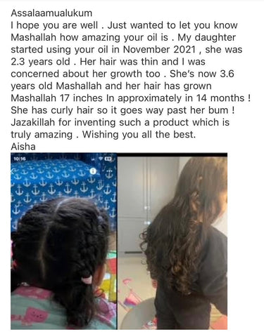 I hope you are well. Just wanted to let you know Mashallah how amazing your oil is. My daughter started using your oil in November 2021, she was 2.3 years old. Her hair was thin and I was concerned about her growth too. She's now 3.6 years old Mashallah and her hair has grown Mashallah 17 inches in approximately 14 months! She has curly hair so it goes way past her bum!Jazakillah for inventing such a product which is truly amazing. Wishing you all the best. Aisha