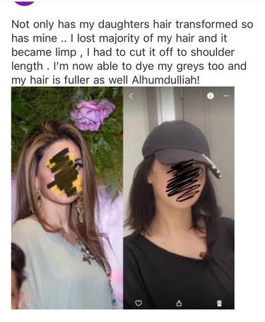 Not only has my daughter's hair transformed, so has mine. I lost majority of my hair and it became limp. I had to cut it off to shoulder length. I'm now able to dye my greys too and my hair is fuller as well Alhumdulillah!